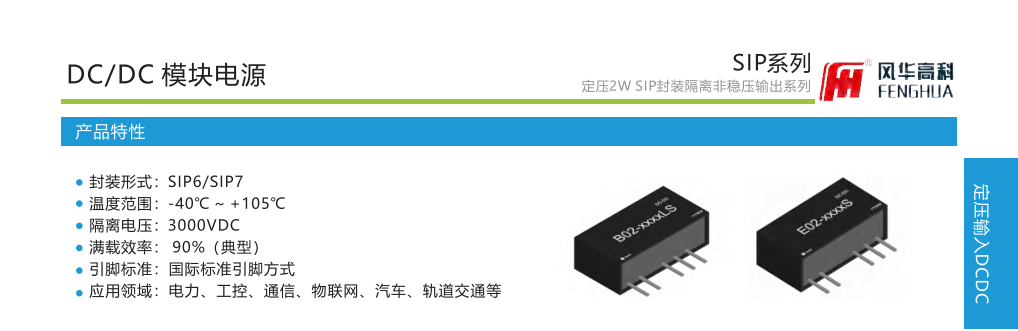 产品特性:封装形式:SIP6/SIP7温度范围:-40℃~+105℃隔离电压:3000VDC满载效率:90%(典型)。引脚标准:国际标准引脚方式应用领域:电力、工控、通信、物联网、汽车、轨道交通等